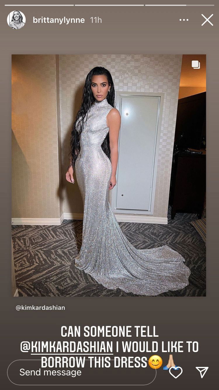 However, Kim’s dress even drew Brittany towards her. In her Instagram story, Matthews mentioned the 41-year-old and wrote, “Can someone tell @KimKardashian I would like to borrow this dress.”