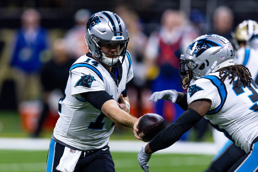 NFL, American Football Herren, USA Carolina Panthers at New Orleans Saints Jan 8, 2023 New Orleans, Louisiana, USA Carolina Panthers quarterback Sam Darnold 14 hands off to running back D Onta Foreman 33 against the New Orleans Saints during the first half at Caesars Superdome. New Orleans Caesars Superdome Louisiana USA, EDITORIAL USE ONLY PUBLICATIONxINxGERxSUIxAUTxONLY Copyright: xStephenxLewx 20230108_ams_la1_0129