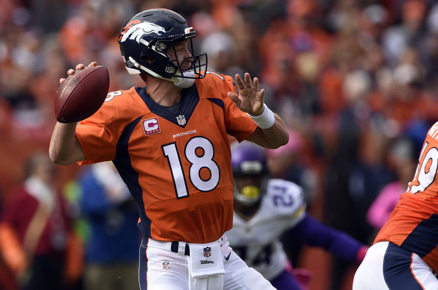 DENVER, CO – OCTOBER 4: Peyton Manning (18) of the Denver Broncos passes the ball for a gain of 27 yards in the first quarter. The Denver Broncos played the Minnesota Vikings at Sports Authority Field at Mile High in Denver, CO on October 4, 2015. (Photo by Helen H. Richardson/The Denver Post)