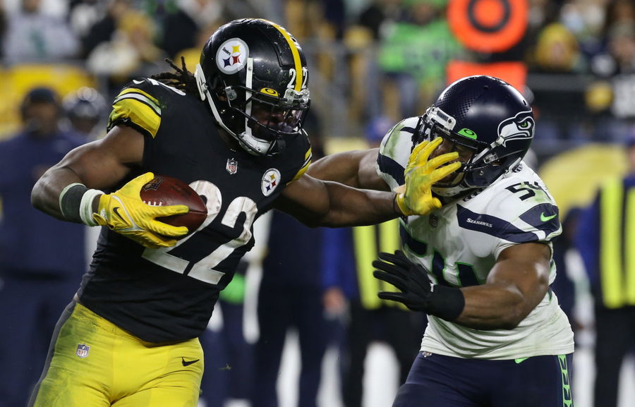 Oct 17, 2021; Pittsburgh, Pennsylvania, USA; Pittsburgh Steelers running back Najee Harris (22) stiff arms Seattle Seahawks middle linebacker Bobby Wagner (54) as he runs the ball during the third quarter at Heinz Field. Mandatory Credit: Charles LeClaire-USA TODAY Sports