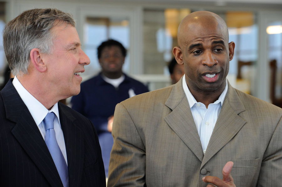 March 12, 2013 – Mckinney, Texas, U.S. – Pro Football Hall of Famer DEION SANDERS, right, flanked by his attorney RICK ROBERTSON, speaks to the media after winning a favorable verdict in a custody trial with his estranged wife at the Collin County Courthouse. He was awarded primary custody of his two sons pending his divorce. Deion Sanders Custody Trial Verdict – ZUMAc04 “Image Credits: Imago”