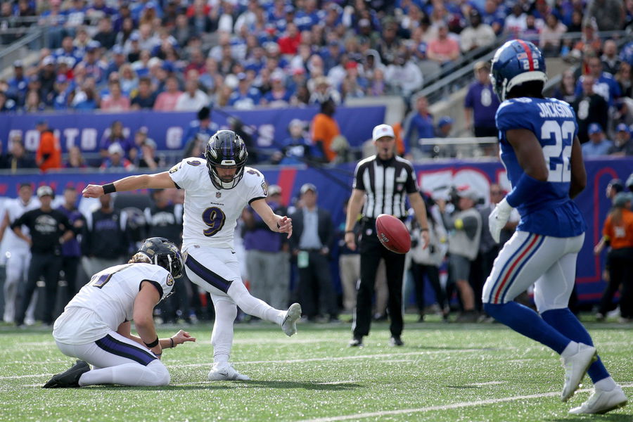 Oct 16, 2022; East Rutherford, New Jersey, USA; Baltimore Ravens place kicker Justin Tucker (9) kicks a field goal during the third quarter against the New York Giants at MetLife Stadium. Mandatory Credit: Brad Penner-USA TODAY Sports