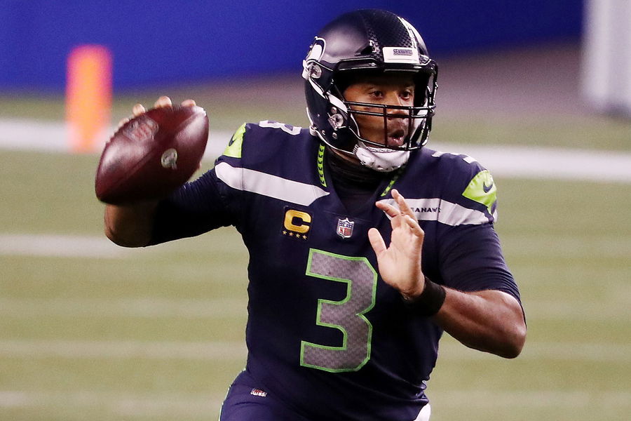 SEATTLE, WASHINGTON – SEPTEMBER 20: Russell Wilson #3 of the Seattle Seahawks looks to pass during the second half against the New England Patriots at CenturyLink Field on September 20, 2020 in Seattle, Washington. (Photo by Abbie Parr/Getty Images)