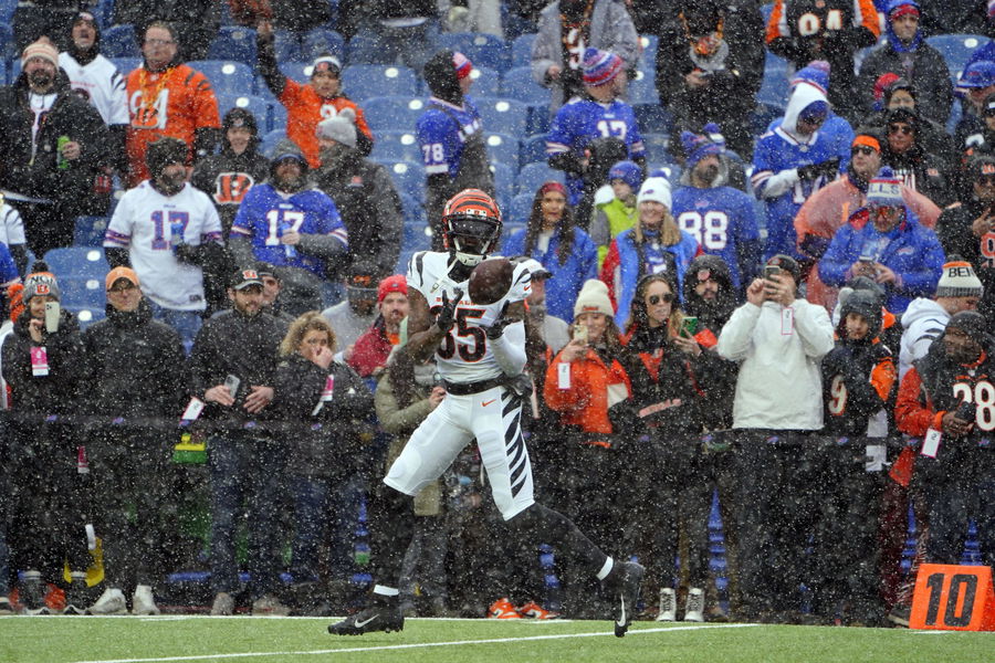 NFL, American Football Herren, USA AFC Divisional Round-Cincinnati Bengals at Buffalo Bills Jan 22, 2023 Orchard Park, New York, USA Cincinnati Bengals wide receiver Tee Higgins 85 warms up before an AFC divisional round game between the Buffalo Bills and the Cincinnati Bengals at Highmark Stadium. Orchard Park Highmark Stadium New York USA, EDITORIAL USE ONLY PUBLICATIONxINxGERxSUIxAUTxONLY Copyright: xGregoryxFisherx 20230122_jcd_fb5_0091
