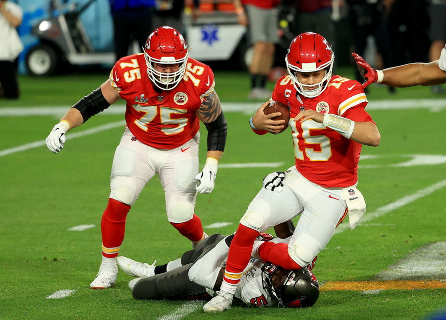 TAMPA, FLORIDA – FEBRUARY 07: Shaquil Barrett #58 of the Tampa Bay Buccaneers sacks Patrick Mahomes #15 of the Kansas City Chiefs during the third quarter in Super Bowl LV at Raymond James Stadium on February 07, 2021 in Tampa, Florida. (Photo by Mike Ehrmann/Getty Images)