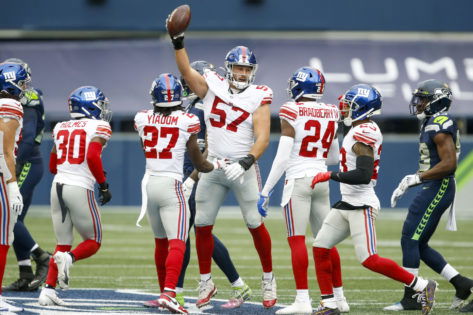 Dec 6, 2020; Seattle, Washington, USA; New York Giants defensive end Niko Lalos (57) reacts after recovering a fumble against the Seattle Seahawks during the second quarter at Lumen Field. Mandatory Credit: Joe Nicholson-USA TODAY Sports