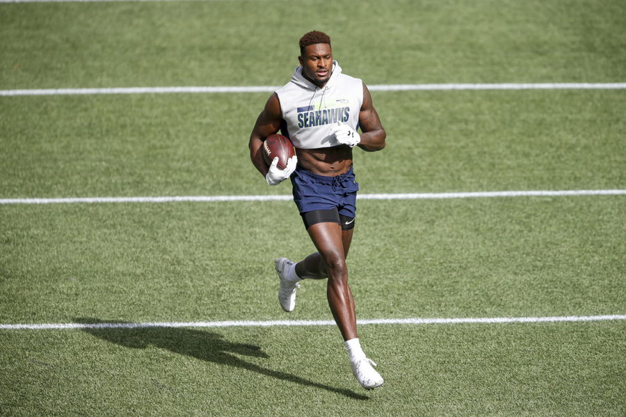 Sep 27, 2020; Seattle, Washington, USA; Seattle Seahawks wide receiver DK Metcalf (14) participates in a pregame warmup drill against the Dallas Cowboys at CenturyLink Field. Mandatory Credit: Joe Nicholson-USA TODAY Sports