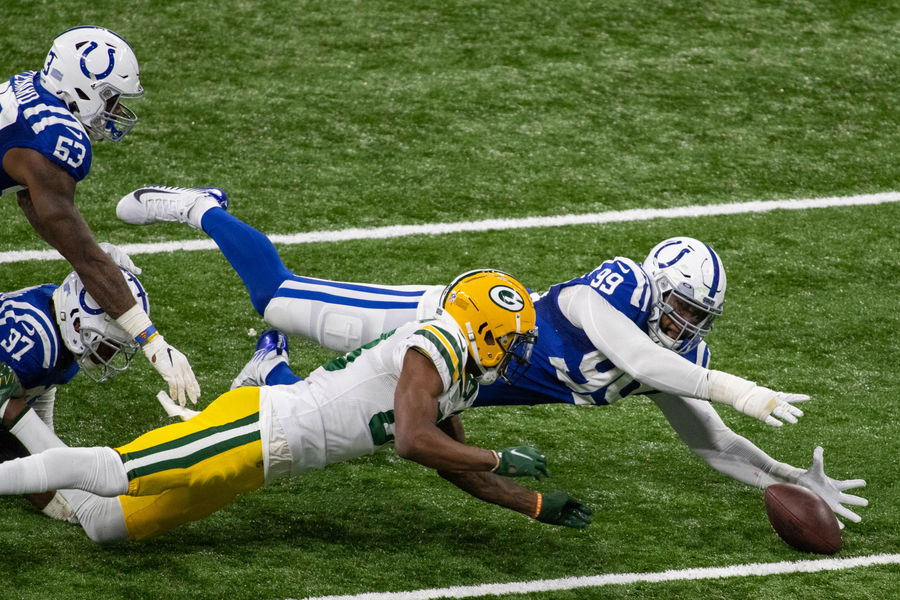 Nov 22, 2020; Indianapolis, Indiana, USA; Indianapolis Colts defensive tackle DeForest Buckner (99) dives on a loose ball against Green Bay Packers wide receiver Marquez Valdes-Scantling (83) in overtime at Lucas Oil Stadium. Mandatory Credit: Trevor Ruszkowski-USA TODAY Sports