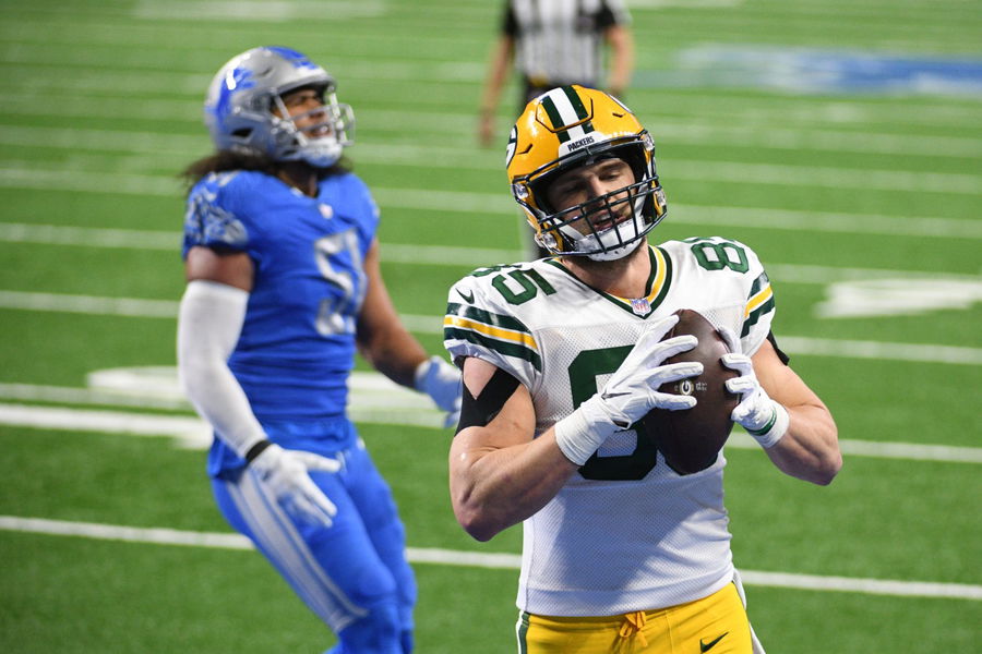 Dec 13, 2020; Detroit, Michigan, USA; Green Bay Packers tight end Robert Tonyan (85) scores a touchdown during the fourth quarter against the Detroit Lions at Ford Field. Mandatory Credit: Tim Fuller-USA TODAY Sports