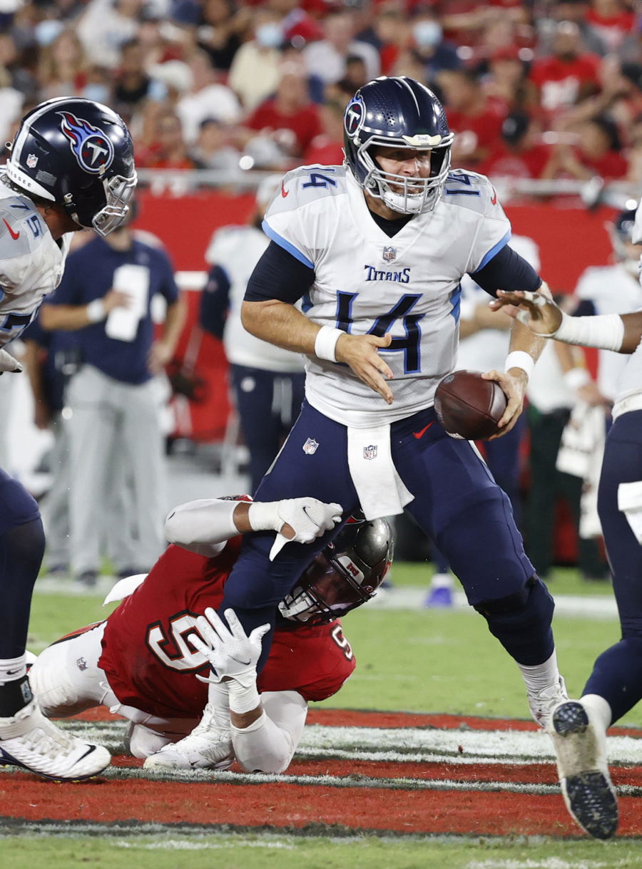 Aug 21, 2021; Tampa, Florida, USA; Tampa Bay Buccaneers linebacker Joe Tryon-Shoyinka (9) sacks Tennessee Titans quarterback Matt Barkley (14) during the second quarter at Raymond James Stadium. Mandatory Credit: Kim Klement-USA TODAY Sports