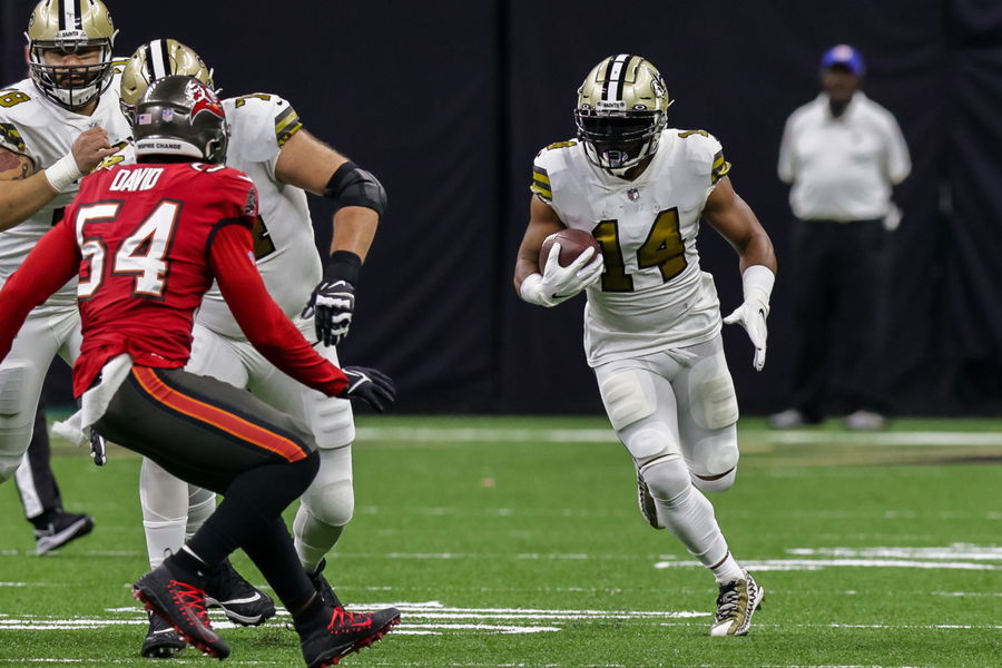 Oct 31, 2021; New Orleans, Louisiana, USA; New Orleans Saints running back Mark Ingram II (14) runs against Tampa Bay Buccaneers linebacker Lavonte David (54) during the first half at Caesars Superdome. Mandatory Credit: Stephen Lew-USA TODAY Sports