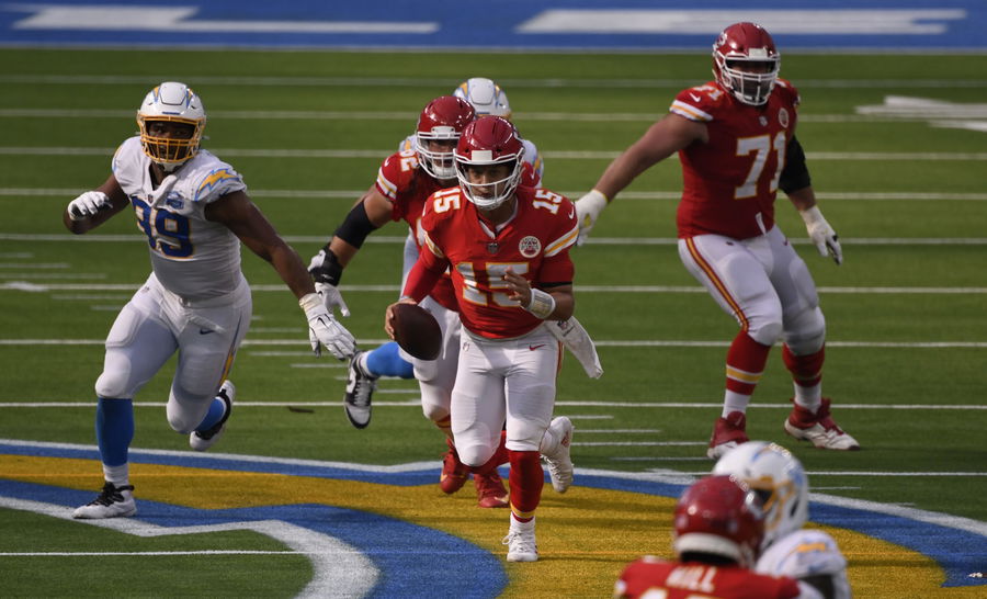 Sep 20, 2020; Inglewood, California, USA; Kansas City Chiefs quarterback Patrick Mahomes (15) runs the ball against the Los Angeles Chargers during the fourth quarter at SoFi Stadium. Mandatory Credit: Robert Hanashiro-USA TODAY Sports