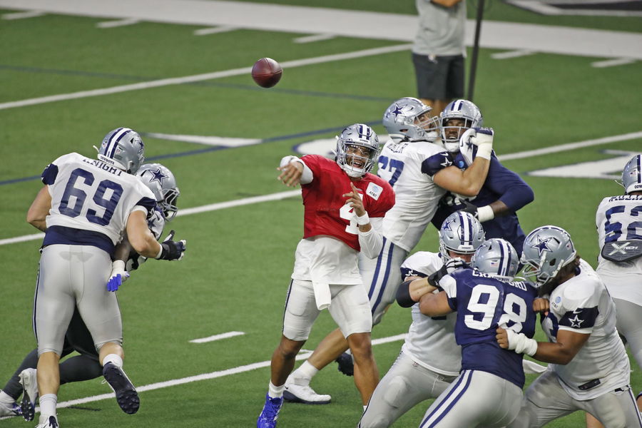 Aug 24, 2020; Frisco, TX, USA; Dallas Cowboys quarterback Dak Prescott during training camp at Ford Center at The Star in Frisco, Texas. Mandatory Credit: James D. Smith via USA TODAY Sports