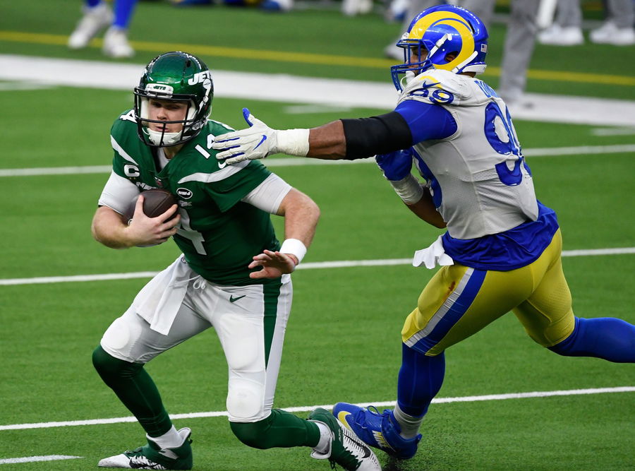 Dec 20, 2020; Inglewood, California, USA; New York Jets quarterback Sam Darnold (14) tries to run away from Los Angeles Rams defensive end Aaron Donald (99) during the third quarter at SoFi Stadium. Mandatory Credit: Robert Hanashiro-USA TODAY Sports