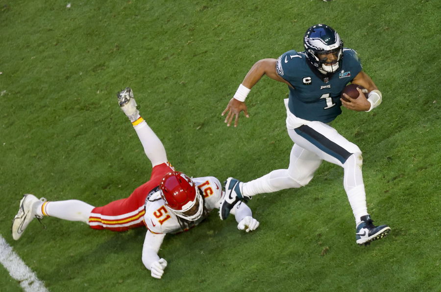 Philadelphia Eagles quarterback Jalen Hurts 1 runs with the ball against the Kansas City Chiefs during the NFL, American Football Herren, USA Super Bowl 57 football game in Glendale, AZ on Feb 12, 2023 Mandatory Photo Credit : /CSM Glendale United States of America – ZUMAc04_ 20230212_zaf_c04_356 Copyright: xCharlesxBausx “Image Credits: Imago”