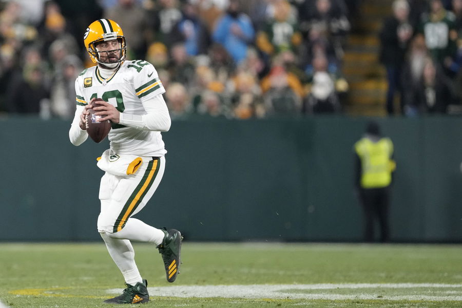 GREEN BAY, WISCONSIN – NOVEMBER 17: Aaron Rodgers #12 of the Green Bay Packers looks to throw a pass against the Tennessee Titans during the second half in the game at Lambeau Field on November 17, 2022 in Green Bay, Wisconsin. (Photo by Patrick McDermott/Getty Images)
