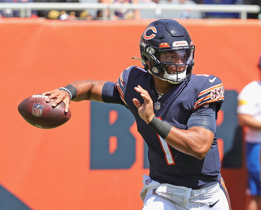 CHICAGO, ILLINOIS – AUGUST 14: Justin Fields #1 of the Chicago Bears passes against the Miami Dolphins during a preseason game at Soldier Field on August 14, 2021 in Chicago, Illinois. (Photo by Jonathan Daniel/Getty Images)