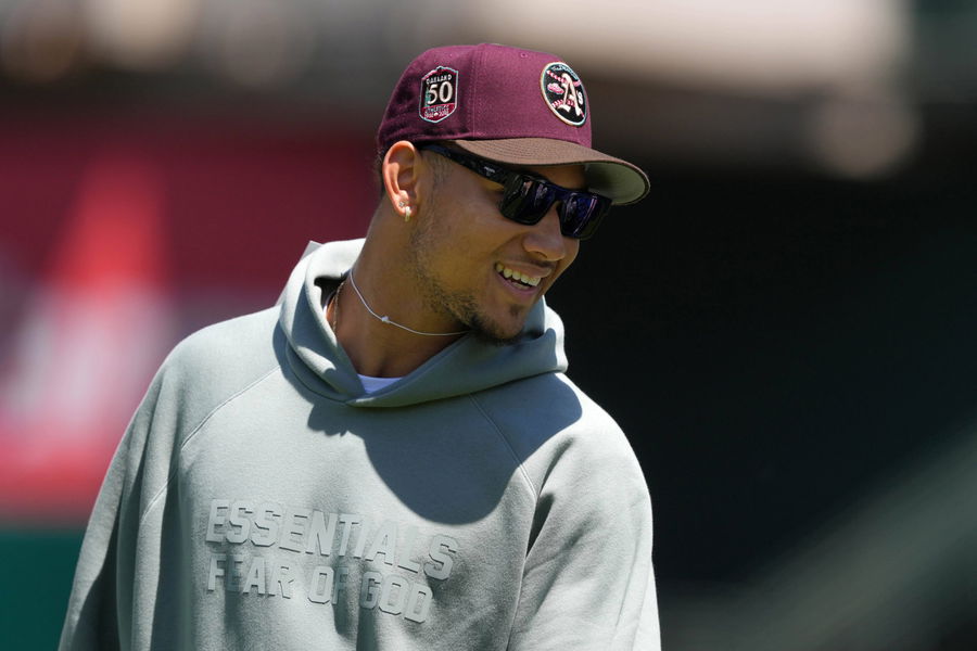 MLB, Baseball Herren, USA Texas Rangers at Oakland Athletics May 14, 2023 Oakland, California, USA San Francisco 49ers quarterback Trey Lance stands on the field before the game between the Oakland Athletics and the Texas Rangers at Oakland-Alameda County Coliseum. Oakland Oakland-Alameda County Coliseum California USA, EDITORIAL USE ONLY PUBLICATIONxINxGERxSUIxAUTxONLY Copyright: xDarrenxYamashitax 20230514_tbs_yl1_084