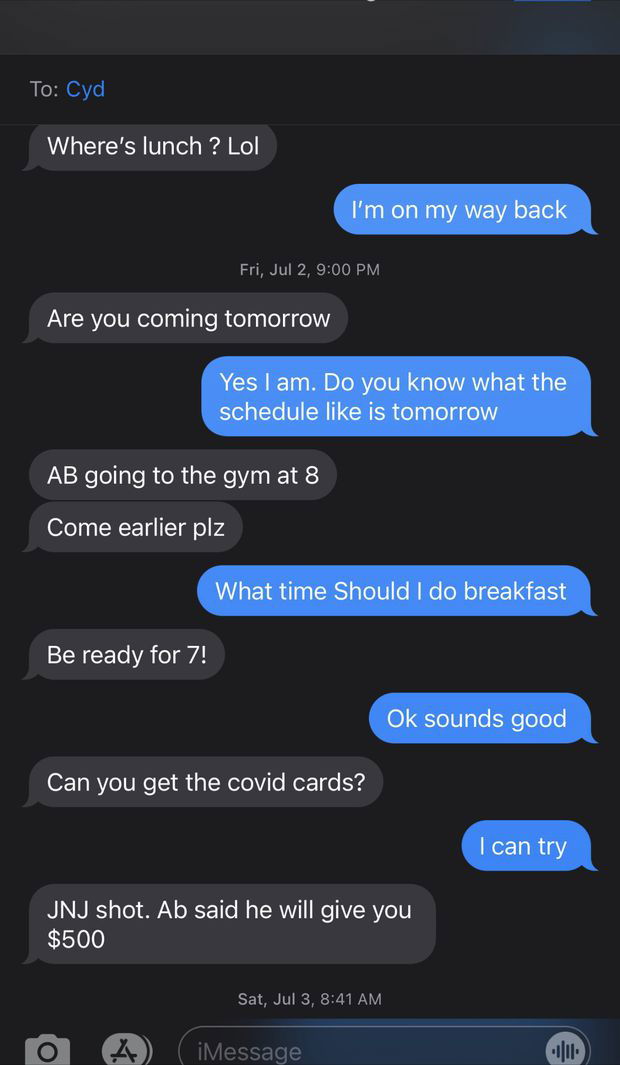 A screenshot of the conversation between Brown’s girlfriend model Cydney Moreau and chef Ruiz hinted at possible arrangements made by the receiver on acquiring fake cards. Although, according to Ruiz, he was unable to arrange the cards for the receiver and his girlfriend. However, later, Brown showed Ruiz the ones he got elsewhere.