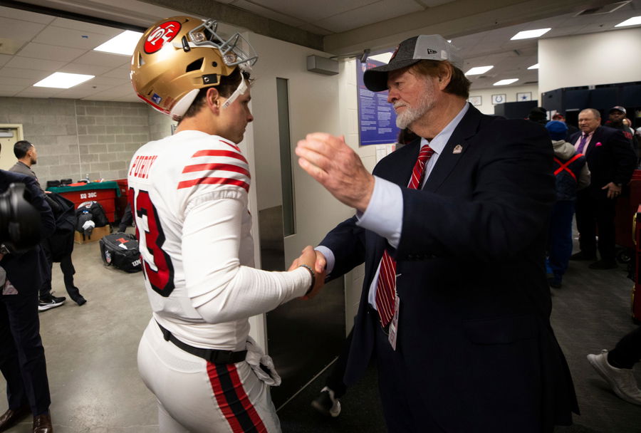SEATTLE, WA – DECEMBER 15: Brock Purdy #13 and Co-Chairman John York of the San Francisco 49ers in the locker room after the game against the Seattle Seahawks at Lumen Field on December 15, 2022 in Seattle, Washington. The 49ers defeated the Seahawks 21-13. (Photo by Michael Zagaris/San Francisco 49ers/Getty Images)