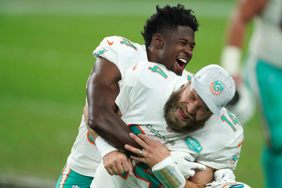 Dec 26, 2020; Paradise, Nevada, USA; Miami Dolphins quarterback Ryan Fitzpatrick (14) celebrates with wide receiver Isaiah Ford (84) after the game against the Las Vegas Raiders at Allegiant Stadium. The Dolphins defeated the Raiders 26-25. Mandatory Credit: Kirby Lee-USA TODAY Sports