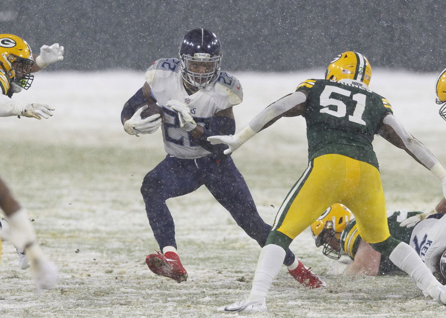 Dec 27, 2020; Green Bay, Wisconsin, USA; Tennessee Titans running back Derrick Henry (22) rushes with the football against the Green Bay Packers at Lambeau Field. Mandatory Credit: Jeff Hanisch-USA TODAY Sports