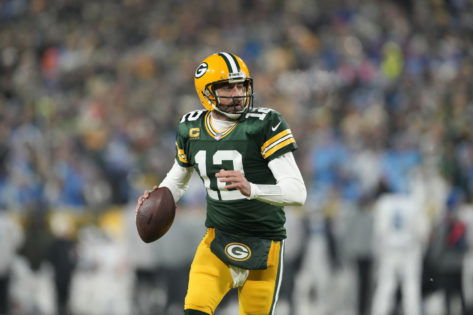 GREEN BAY, WISCONSIN – JANUARY 08: Aaron Rodgers #12 of the Green Bay Packers scrambles with the ball against the Detroit Lions in the first half at Lambeau Field on January 08, 2023, in Green Bay, Wisconsin. (Photo by Patrick McDermott/Getty Images)