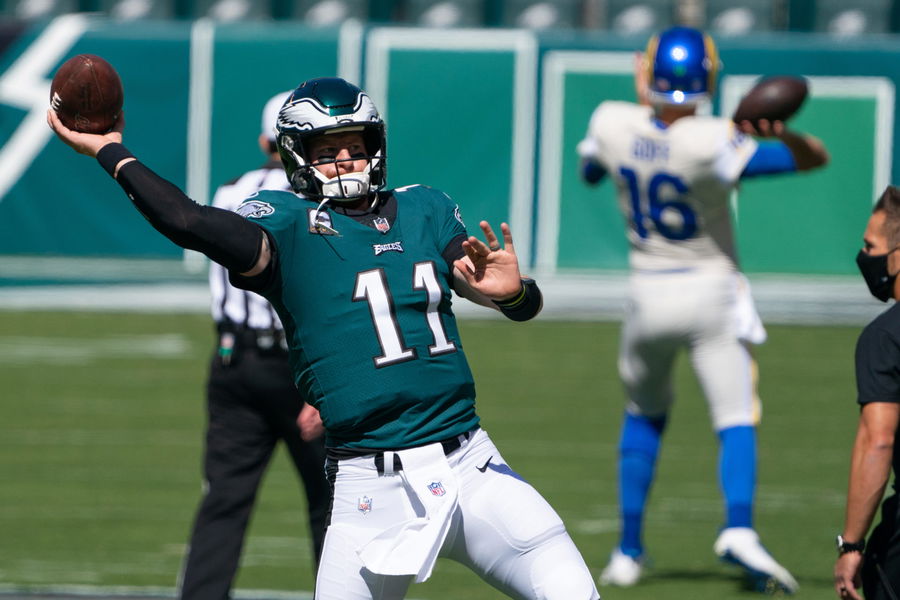 Sep 20, 2020; Philadelphia, Pennsylvania, USA; Philadelphia Eagles quarterback Carson Wentz (11) passes the ball against the Los Angeles Rams during the first quarter at Lincoln Financial Field. Mandatory Credit: Bill Streicher-USA TODAY Sports