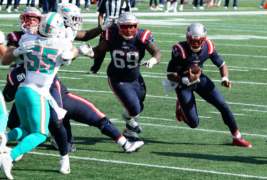 Sep 13, 2020; Foxborough, Massachusetts, USA; New England Patriots quarterback Cam Newton (1) runs the ball against the Miami Dolphins in the fourth quarter at Gillette Stadium. Mandatory Credit: David Butler II-USA TODAY Sports