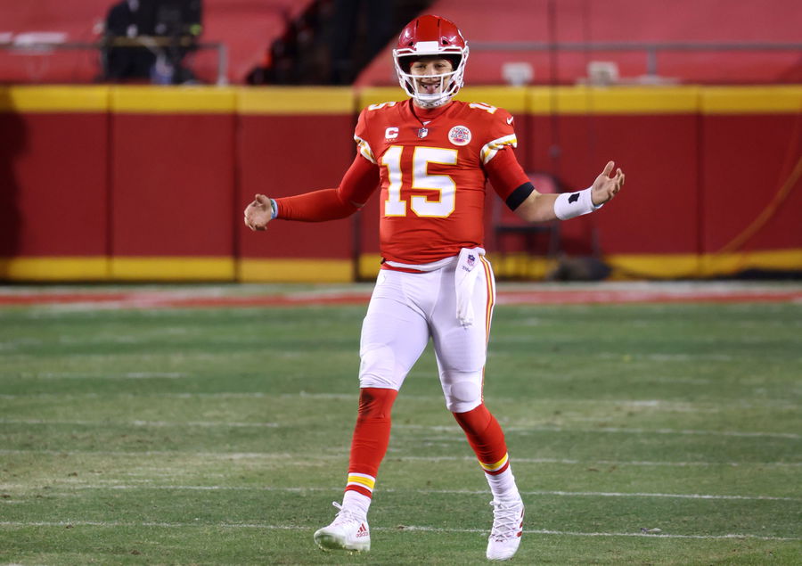 KANSAS CITY, MISSOURI – JANUARY 24: Patrick Mahomes #15 of the Kansas City Chiefs celebrates after throwing a touchdown pass in the fourth quarter against the Buffalo Bills during the AFC Championship game at Arrowhead Stadium on January 24, 2021 in Kansas City, Missouri. (Photo by Jamie Squire/Getty Images)