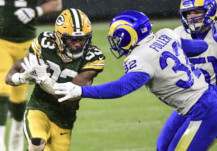 Jan 16, 2021; Green Bay, Wisconsin, USA; Green Bay Packers running back Aaron Jones (33) carries the ball against Los Angeles Rams cornerback Darious Williams (31) in the second quarter at Lambeau Field. Mandatory Credit: Benny Sieu-USA TODAY Sports