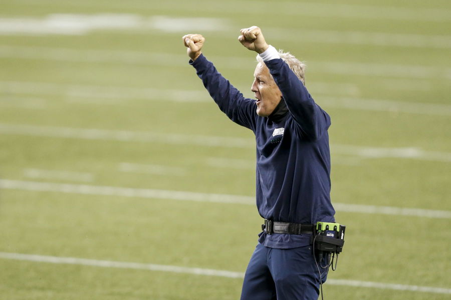 Sep 20, 2020; Seattle, Washington, USA; Seattle Seahawks head coach Pete Carroll celebrates following the final play of a 35-30 victory against the New England Patriots at CenturyLink Field. Mandatory Credit: Joe Nicholson-USA TODAY Sports