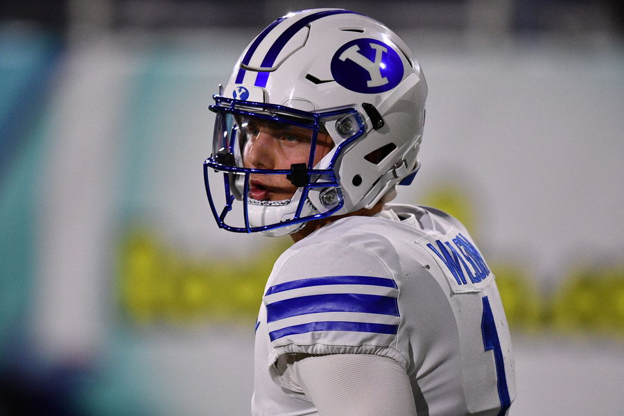 BOCA RATON, FLORIDA – DECEMBER 22: Zach Wilson #1 of the Brigham Young Cougars looks on prior to the game against the Central Florida Knights at FAU Stadium on December 22, 2020 in Boca Raton, Florida. (Photo by Mark Brown/Getty Images)