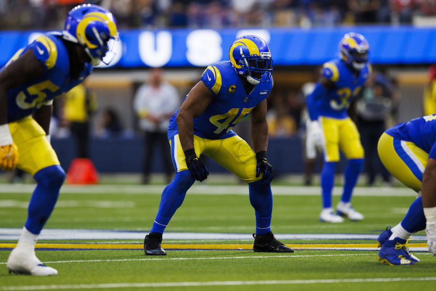 INGLEWOOD, CA – OCTOBER 30: Los Angeles Rams linebacker Bobby Wagner 45 defends during an NFL, American Football Herren, USA football game between the San Francisco 49ers and the Los Angeles Rams on October 30, 2022 at SoFi Stadium in Inglewood, CA. Photo by Ric Tapia/Icon Sportswire NFL: OCT 30 49ers at Rams Icon269221030179