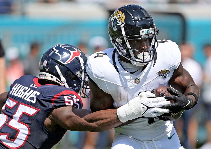 Sep 24, 2023; Jacksonville, Florida, USA; Houston Texans linebacker Jerry Hughes (55) tackles Jacksonville Jaguars running back Tank Bigsby (4) during the second half at EverBank Stadium. Mandatory Credit: Melina Myers-USA TODAY Sports