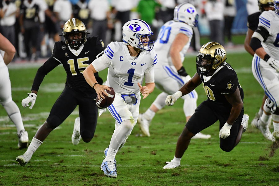 Dec 22, 2020; Boca Raton, Florida, USA; Brigham Young Cougars quarterback Zach Wilson (1) scrambles with the ball against the UCF Knights during the first half at FAU Stadium. Mandatory Credit: Jasen Vinlove-USA TODAY Sports