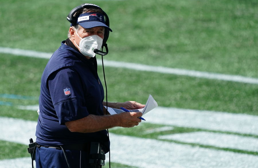Sep 13, 2020; Foxborough, Massachusetts, USA; New England Patriots head coach Bill Belichick watches from the sideline as they take on the Miami Dolphins at Gillette Stadium. Mandatory Credit: David Butler II-USA TODAY Sports