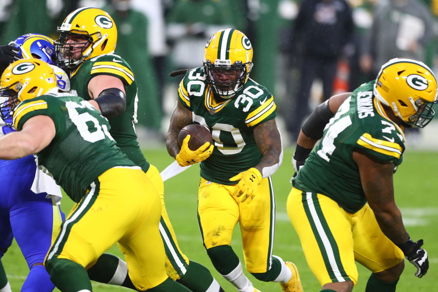 Jan 16, 2021; Green Bay, Wisconsin, USA; Green Bay Packers running back Jamaal Williams (30) runs the ball during the first half of a NFC Divisional Round playoff game against the Los Angeles Rams at Lambeau Field. Mandatory Credit: Mark J. Rebilas-USA TODAY Sports