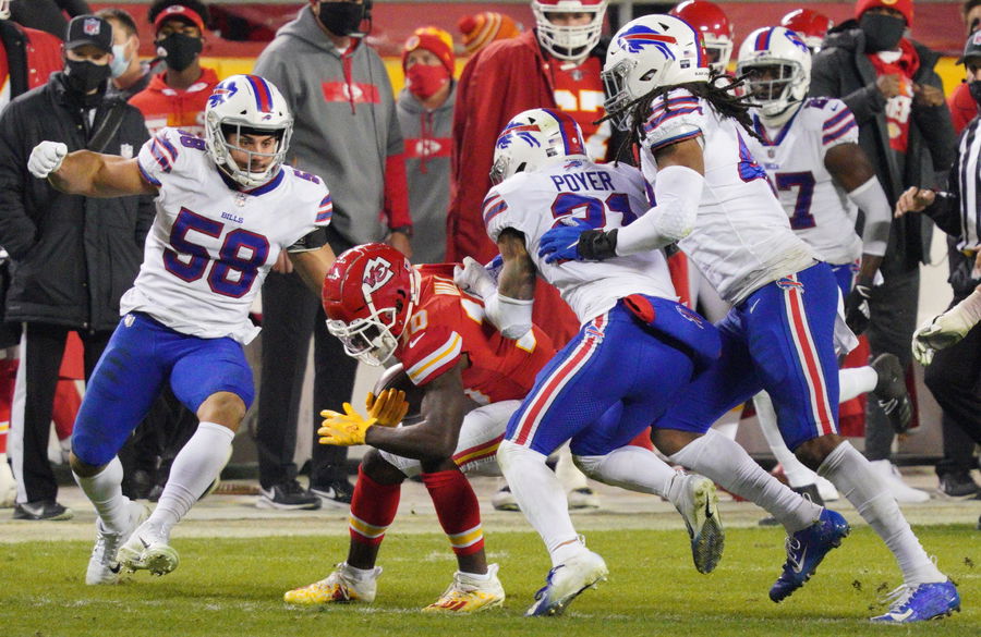 Jan 24, 2021; Kansas City, MO, USA; Kansas City Chiefs wide receiver Tyreek Hill (10) is tackled by Buffalo Bills free safety Jordan Poyer (21) and outside linebacker Matt Milano (58) during the third quarter in the AFC Championship Game at Arrowhead Stadium. Mandatory Credit: Denny Medley-USA TODAY Sports