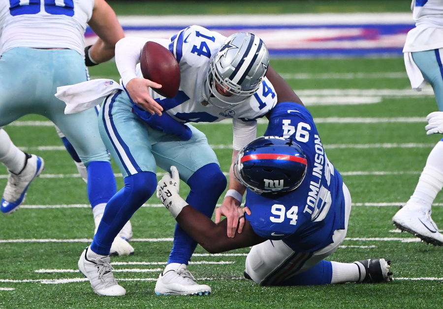 Jan 3, 2021; East Rutherford, NJ, USA; Dallas Cowboys quarterback Andy Dalton (14) is sacked by New York Giants nose tackle Dalvin Tomlinson (94) in the first half at MetLife Stadium. Mandatory Credit: Robert Deutsch-USA TODAY Sports