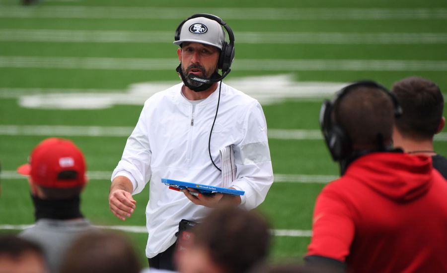 Sep 27, 2020; East Rutherford, New Jersey, USA; San Francisco 49ers head coach Kyle Shanahan during the second quarter of a NFL football game against the New York Giants at MetLife Stadium. Mandatory Credit: Robert Deutsch-USA TODAY Sports