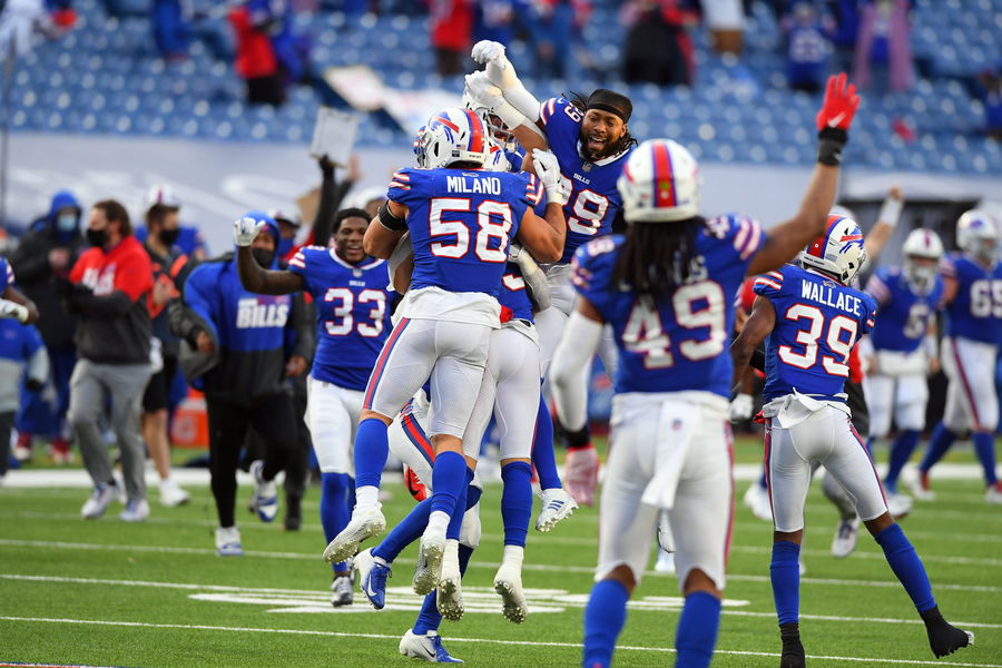 Jan 9, 2021; Orchard Park, New York, USA; Buffalo Bills cornerback Josh Norman (29) and outside linebacker Matt Milano (58) celebrate the victory against the Indianapolis Colts following the AFC Wild Card game at Bills Stadium. Mandatory Credit: Rich Barnes-USA TODAY Sports