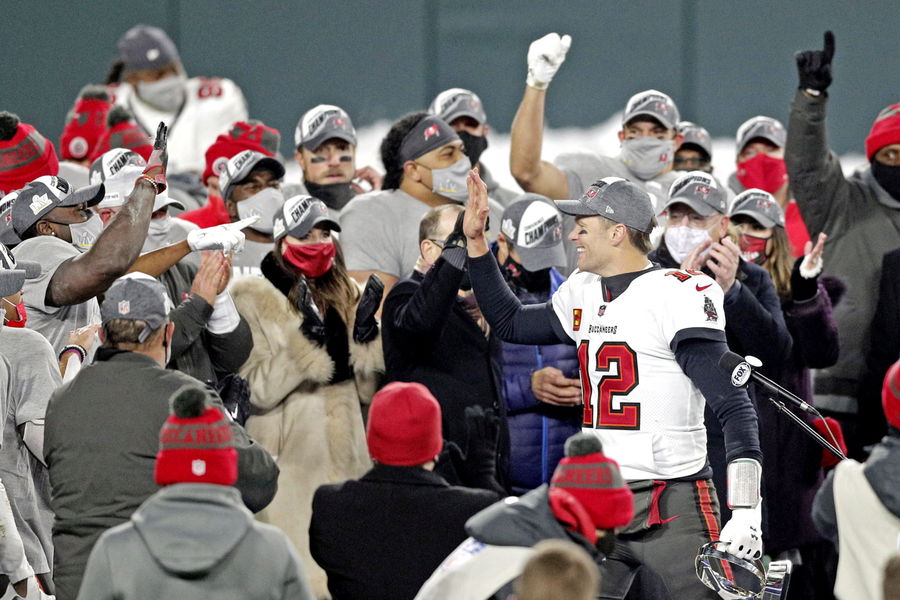 Jan 24, 2021; Green Bay, Wisconsin, USA; Tampa Bay Buccaneers quarterback Tom Brady (12) celebrates with his teammates after beating the Green Bay Packers in the NFC Championship Game at Lambeau Field. Mandatory Credit: Jeff Hanisch-USA TODAY Sports