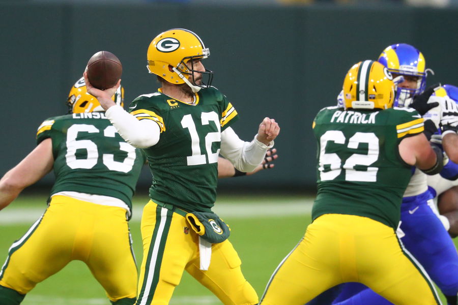 Jan 16, 2021; Green Bay, Wisconsin, USA; Green Bay Packers quarterback Aaron Rodgers (12) throws a pass during the first half of a NFC Divisional Round playoff game against the Los Angeles Rams at Lambeau Field. Mandatory Credit: Mark J. Rebilas-USA TODAY Sports