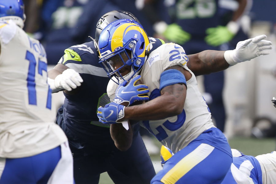 Jan 9, 2021; Seattle, Washington, USA; Seattle Seahawks defensive tackle Poona Ford (97) tackles Los Angeles Rams running back Cam Akers (23) during the first quarter at Lumen Field. Mandatory Credit: Joe Nicholson-USA TODAY Sports