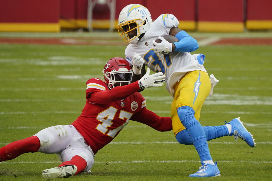 Jan 3, 2021; Kansas City, Missouri, USA; Los Angeles Chargers running back Kalen Ballage (31) runs the ball against Kansas City Chiefs linebacker Darius Harris (47) during the first half at Arrowhead Stadium. Mandatory Credit: Jay Biggerstaff-USA TODAY Sports