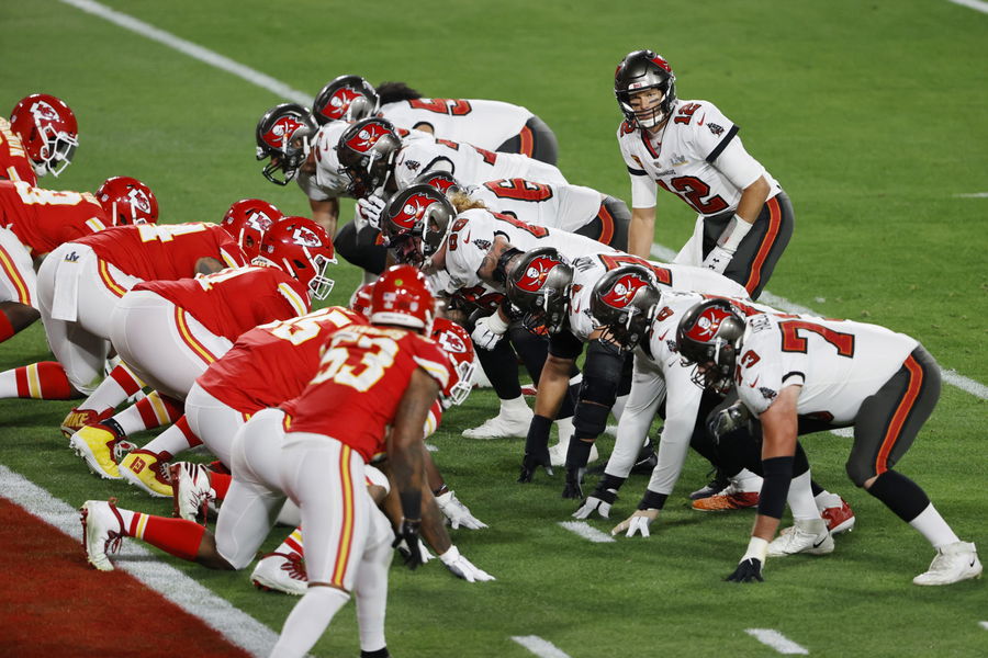 Feb 7, 2020; Tampa, FL, USA; Tampa Bay Buccaneers quarterback Tom Brady (12) against the Kansas City Chiefs during Super Bowl LV. Mandatory Credit: Kim Klement-USA TODAY Sports