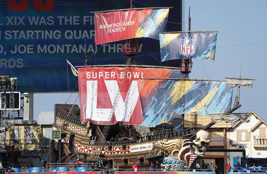Feb 7, 2020; Tampa, FL, USA; General view Super Bowl LV signage on the pirate ship before Super Bowl LV between the Tampa Bay Buccaneers and the Kansas City Chiefs at Raymond James Stadium. Mandatory Credit: Kim Klement-USA TODAY Sports