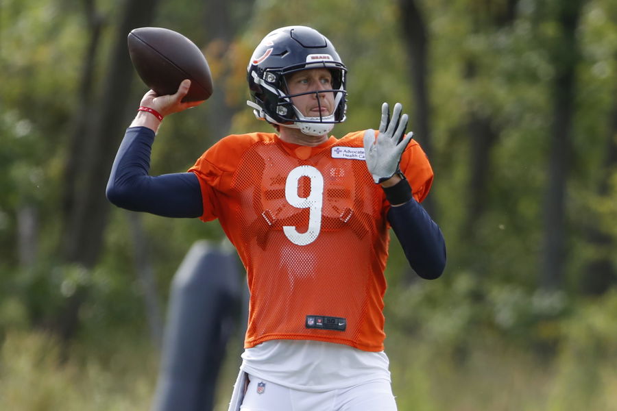 Sep 1, 2020; Lake Forest, Illinois, USA; Chicago Bears quarterback Nick Foles (9) looks to pass the ball during training camp at Halas Hall. Mandatory Credit: Kamil Krzaczynski-USA TODAY Sports