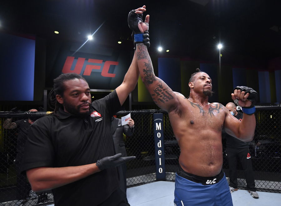 LAS VEGAS, NEVADA – OCTOBER 31: Greg Hardy reacts after his victory over Maurice Greene in a heavyweight bout during the UFC Fight Night event at UFC APEX on October 31, 2020 in Las Vegas, Nevada. (Photo by Jeff Bottari/Zuffa LLC)